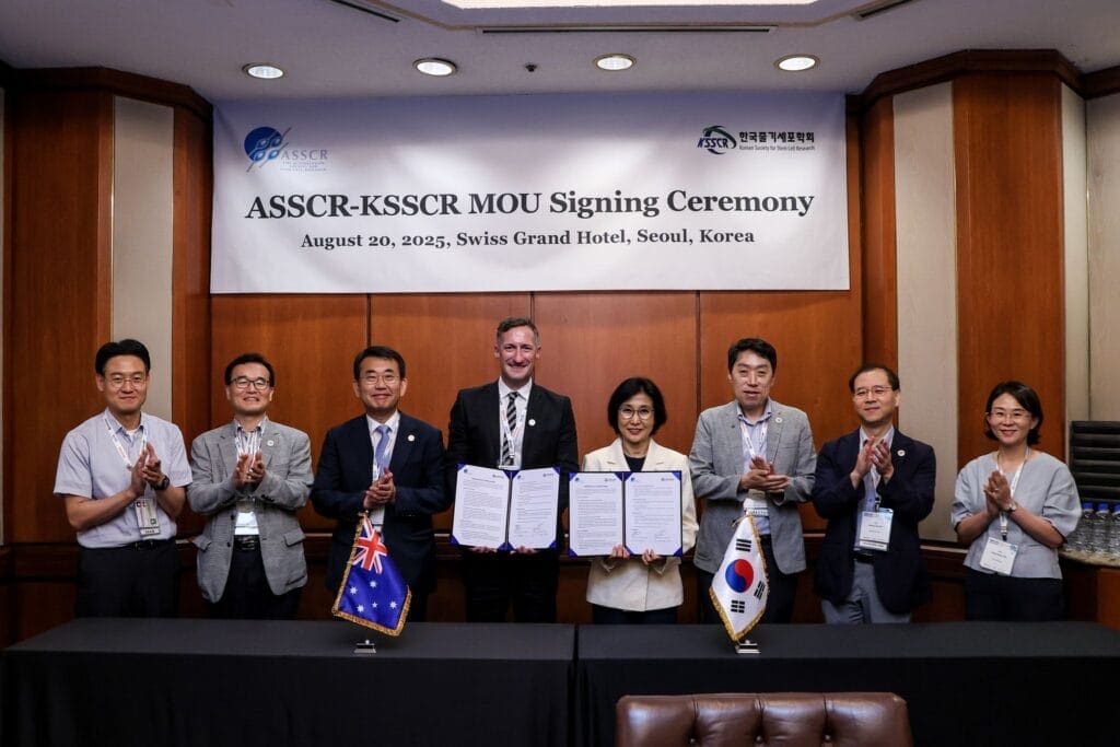 The ASSCR is thrilled to enter into an agreement with the Korean Society for Stem Cell Research (KSSCR), with the signing of an Memorandum of Understanding (MOU) on August 20, 2025 in Seoul, Korea signed by Lincon Stamp (President – ASSCR) and Yun Sil Chang (President – KSSCR). This MOU will strengthen international collaboration in stem cell science and regenerative medicine.